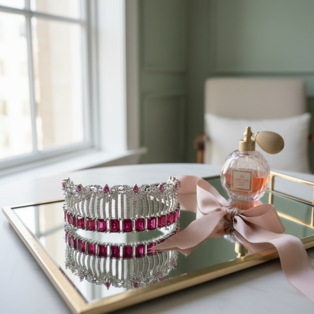 Indulge in timeless elegance with the Royal Ruby Cascade Bracelet, a luxurious statement piece crafted to captivate. This exquisite bracelet features a striking row of emerald-cut ruby-red stones forming a bold lower band, perfectly balanced by an intricate upper layer of brilliant diamond-style crystals arranged in floral motifs.