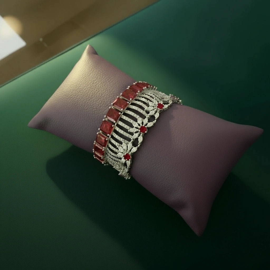 Royal Ruby Cascade Diamond-Style Bracelet – Silver-Tone Luxury Statement Cuff